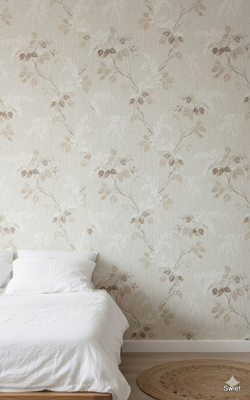 Behang met een subtiele jute-look achtergrond en zachte takken met bladeren in beige- en bruintinten. De natuurlijke uitstraling brengt rust en warmte in huis.