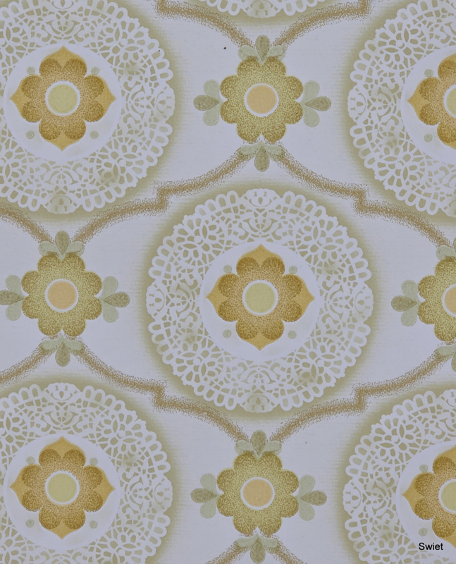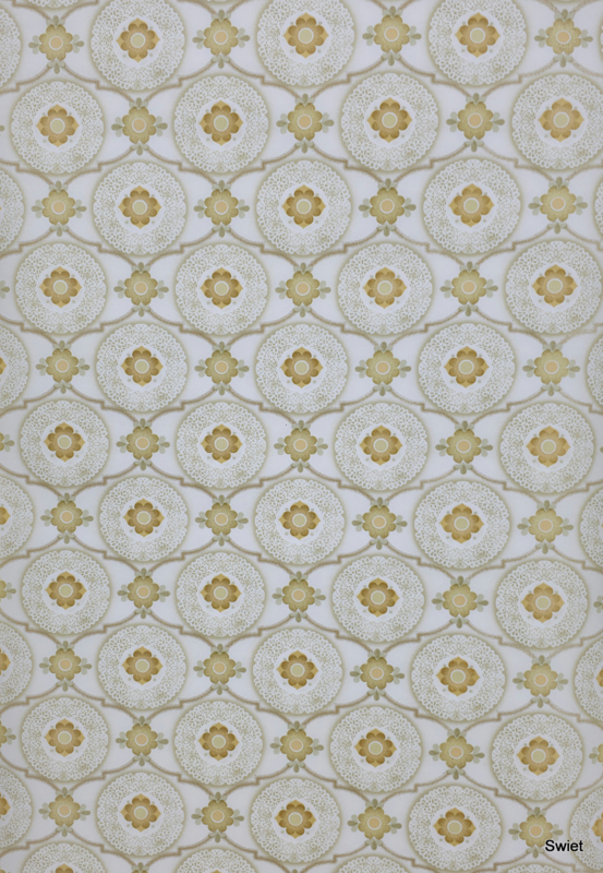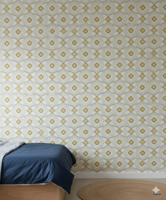 Behang met herhalende medaillons waarin bloemvormen centraal staan. De okergele en olijfgroene accenten contrasteren met de lichte achtergrond en geven het dessin een uitgesproken retro karakter.