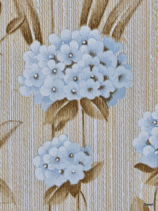 Vintage vinyl behang met een warme beige achtergrond in jute-look. Het dessin toont fijne blauwe bloemetjes, bruine bladeren en aren, speels verspreid over de verticale structuur. De combinatie van zachte tinten en natuurlijke uitstraling geeft dit behang een rustige, landelijke charme.