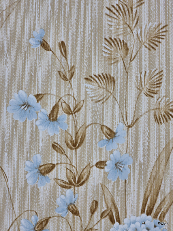 A vintage vinyl wallpaper with jute-look background, soft blue flowers and brown leaves for a natural retro vibe.