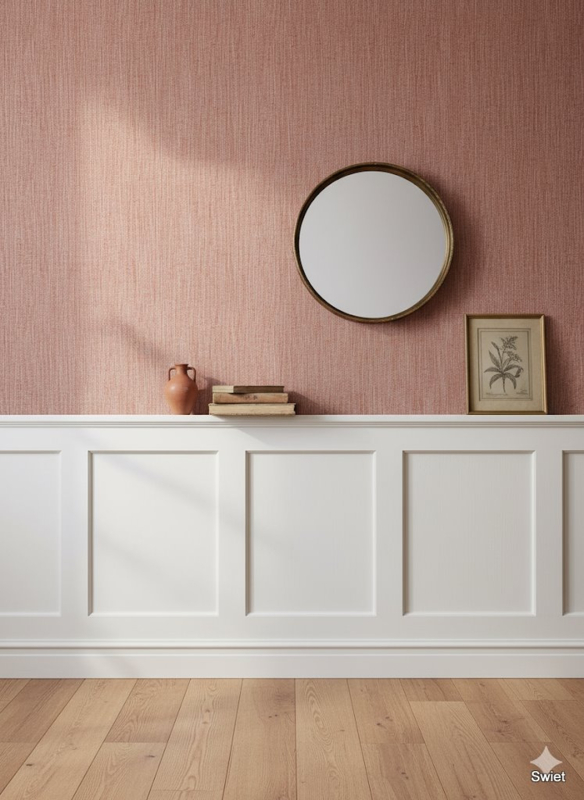 door de combinatie van jute en rood ontstaat een behang dat zowel authentiek als eigentijds is, ideaal voor wie een duurzame en serene basis zoekt.