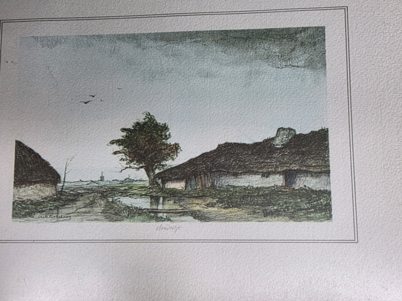 Fijne reproductie naar een winteraquarel van Dirk Baksteen , vloeiweide. De zachte tinten grijsgroen en beige geven het werk een kalme, bijna verstilde sfeer.