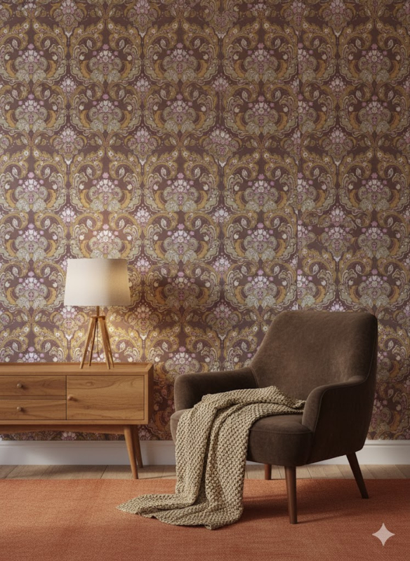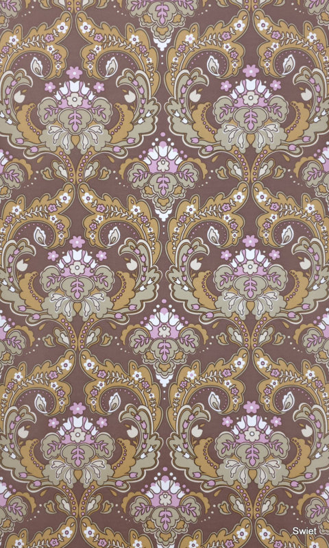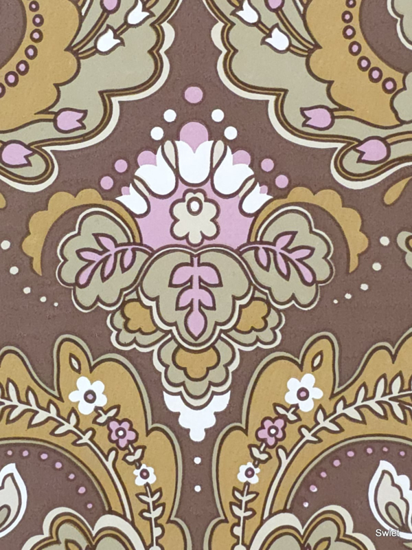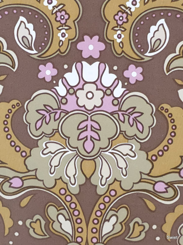 Brown and pink baroque wallpaper with soft romantic 70s feel.