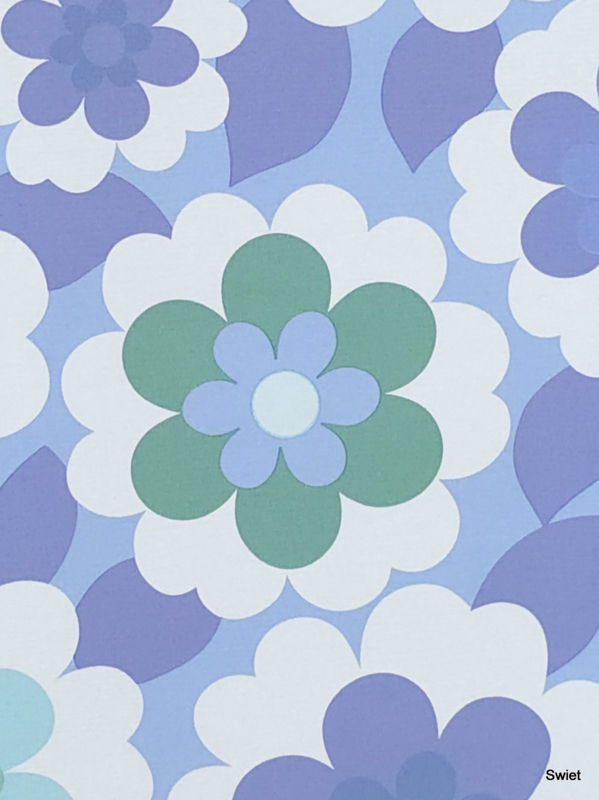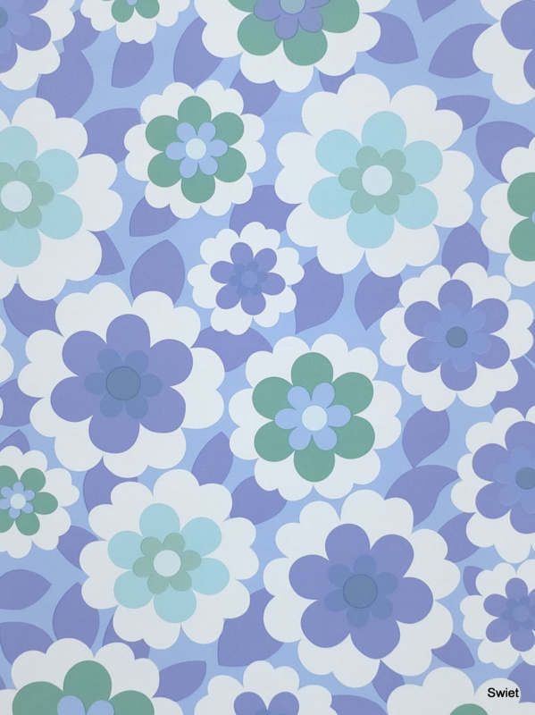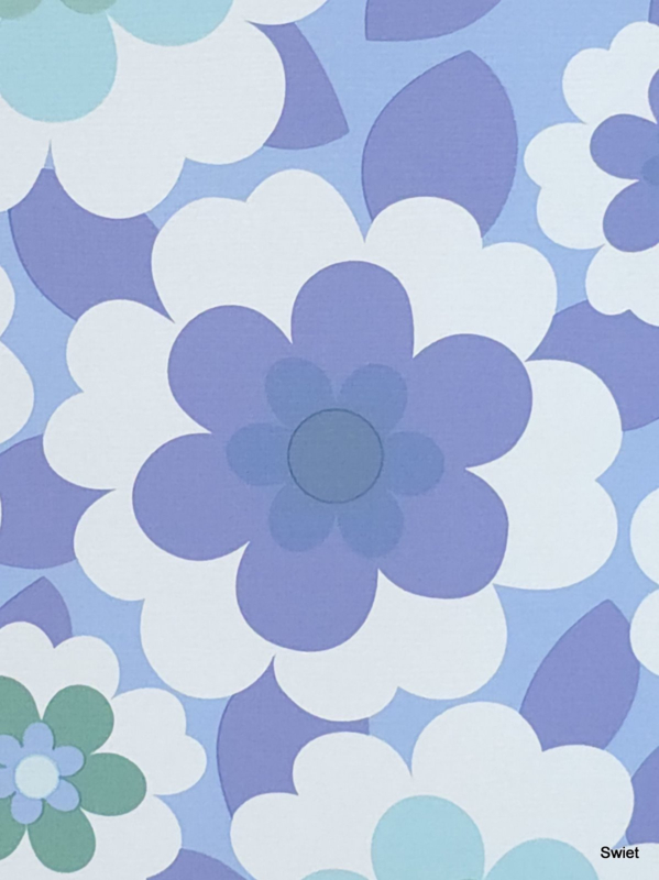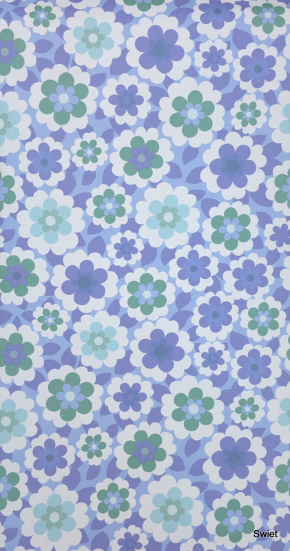 De blauwe uitvoering van het speelse bloemenontwerp van Inke Heiland. Deze retro bloemen wisselen elkaar af in tinten blauw, paars en mintgroen. Het ritme van de vormen en kleuren geeft een kalme, frisse uitstraling met een vleugje nostalgie.
