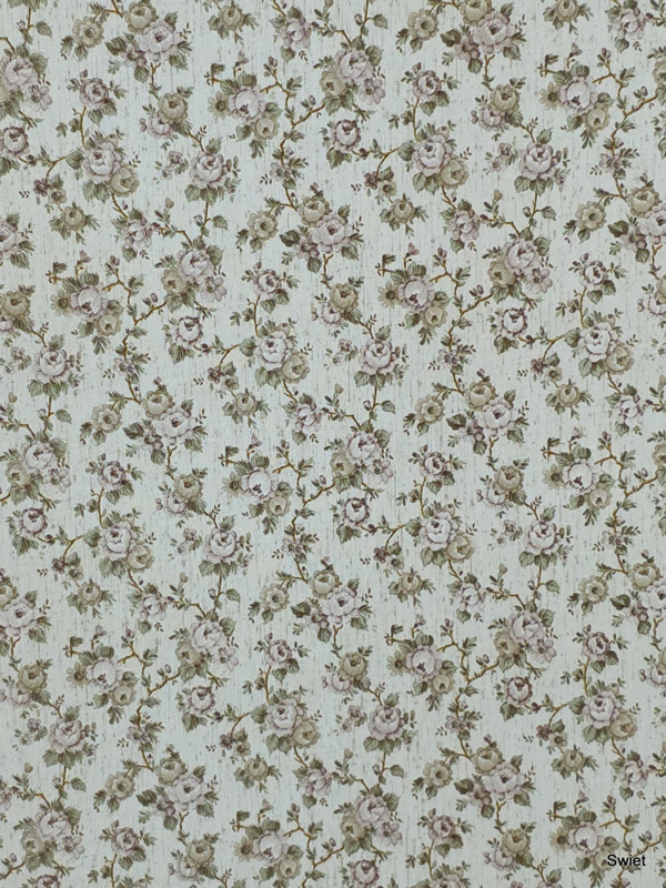 Dit dessin heeft die typische rustige jaren zeventig tot vroege jaren tachtig uitstraling. Een juteachtige achtergrond in licht beige en zand met kleine losse bloemetjes in zacht roze, groen en bruin. Alles ligt fijn verdeeld, waardoor het behang vriendelijk en heel huiselijk oogt. De jutelook maakt het warm, de kleine bloemen geven het iets romantisch zonder dat het zoet wordt.
