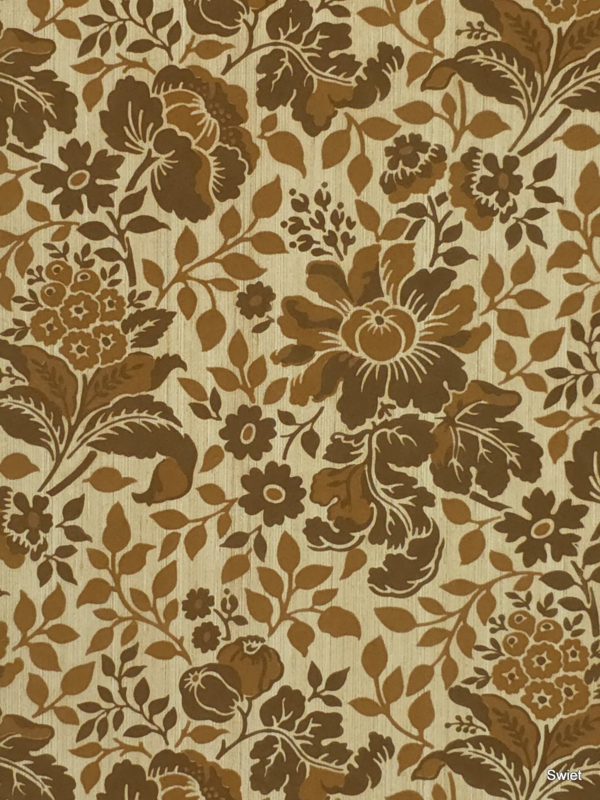 Dit is van dat behang waar je meteen even stil van wordt. Die warme bruine flock, dat zachte veloursgevoel en die volle bloemen die bijna naar je toe lijken te leunen. Het heeft iets van een oud stadscafé in de Jordaan, of zo’n hoekje in een kasteel waar de tijd heeft stilgestaan.