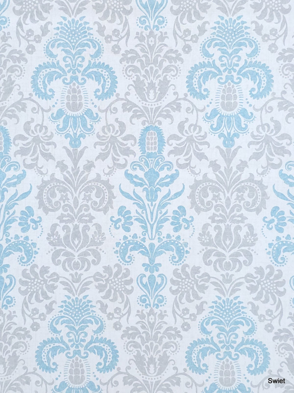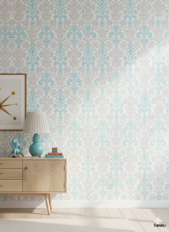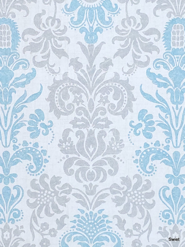 Dit behang heeft dat zachte, bijna romantische seventies gevoel. Het barokmotief is sierlijk maar niet zo uitbundig als de sixties‑versies. De combinatie van lichtgrijs met zacht blauw houdt het rustig en vriendelijk, alsof het dessin vanzelf in de achtergrond meedraait.