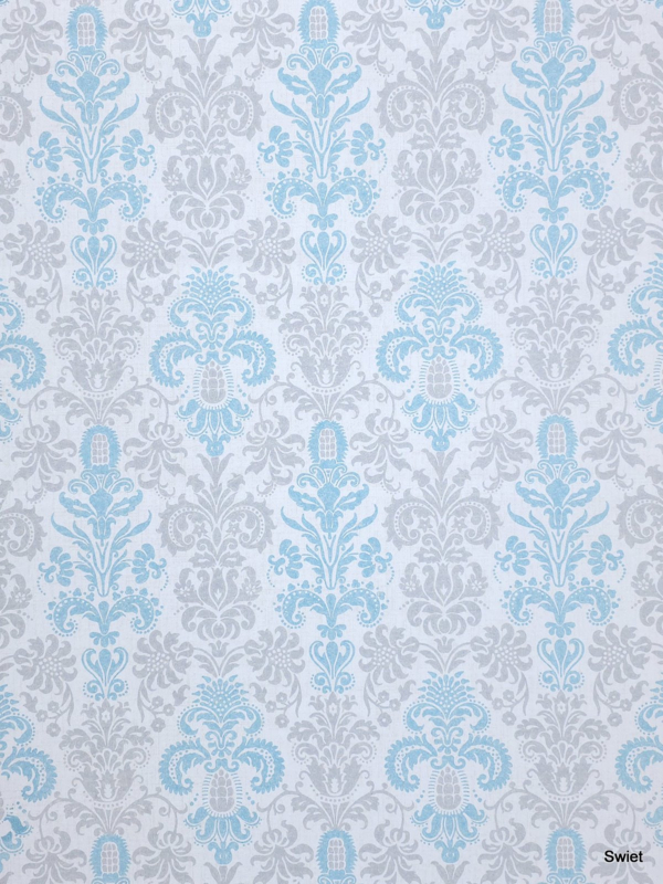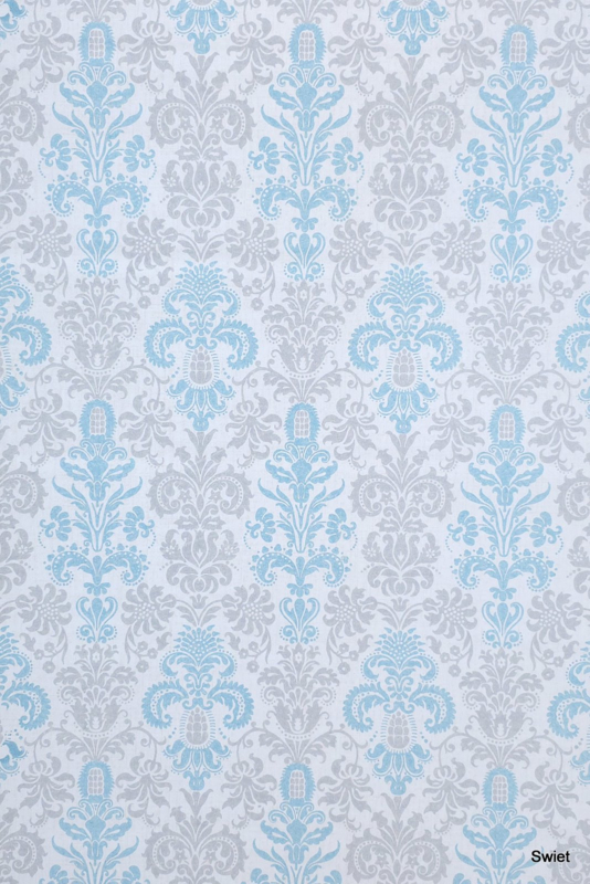 A soft seventies baroque wallpaper in light grey and blue with a calm romantic feel.