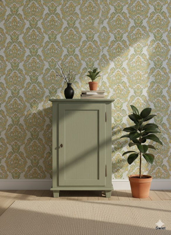 Dit behang heeft die klassieke barokvormen, maar dan in frisse groentinten met een vleugje oker. Je ziet meteen die hippere seventies invloed erin. De vormen zijn sierlijk maar toch luchtig, een beetje alsof klassiek en vrolijk retro elkaar middenin ontmoeten.