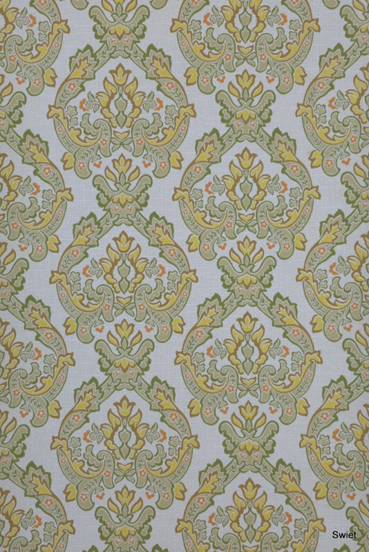 A lively vintage baroque wallpaper with green and ochre tones and a playful seventies feel.