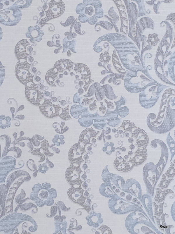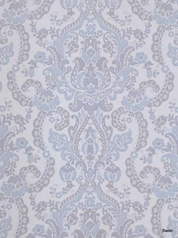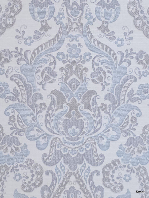 Dit behang heeft een rustige klassieke uitstraling. Zachte barokvormen in lichtblauw en grijs op een heldere basis. De details zijn fijntjes getekend, waardoor het geheel een kalme en elegante sfeer krijgt. Het voelt tijdloos en zacht, precies het soort dessin dat mooi tot zijn recht komt in een rustige setting.