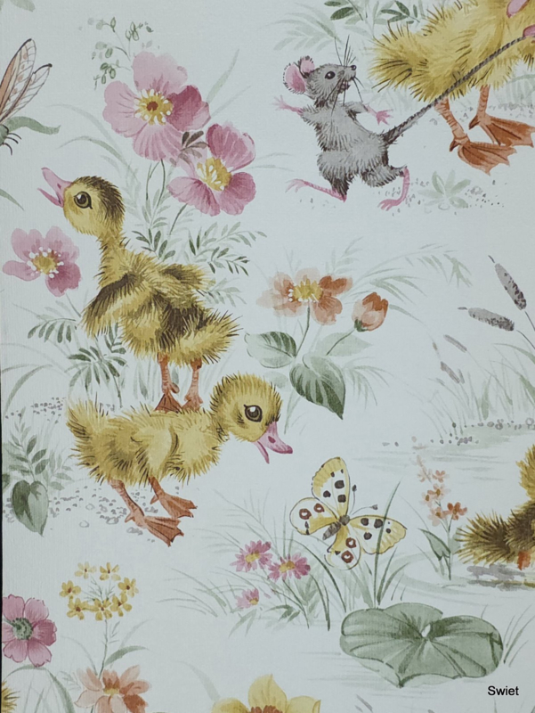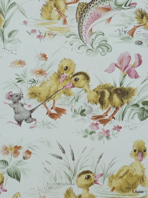 Vintage wallpaper with ducklings, flowers and small animals in soft colours