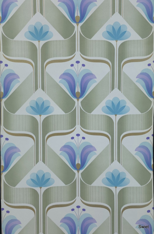 Vintage wallpaper with stylised floral shapes in green, blue and purple tones