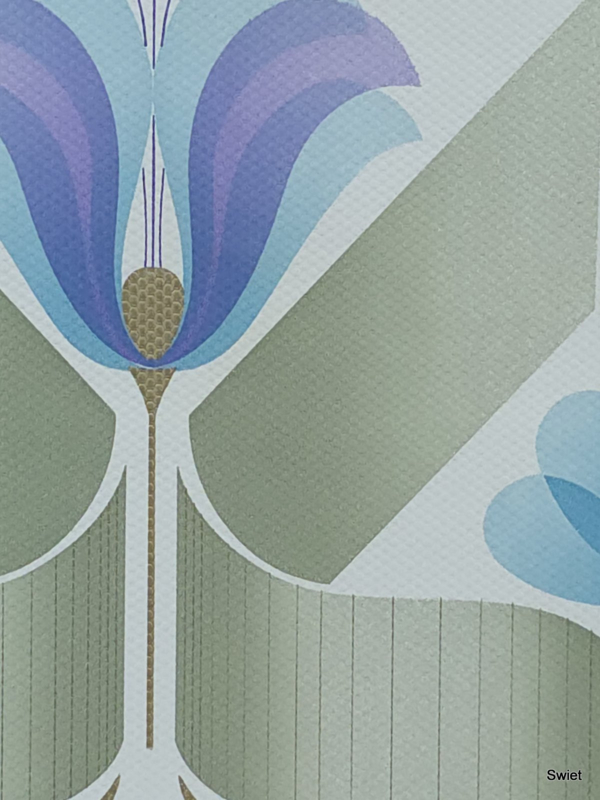 De kleuren bestaan uit lichtgroen, wit, blauw en paars, met hier en daar een bruin accent. De bloemvormen staan in een vast ritme naast elkaar waardoor het dessin een duidelijk en herkenbaar patroon vormt.