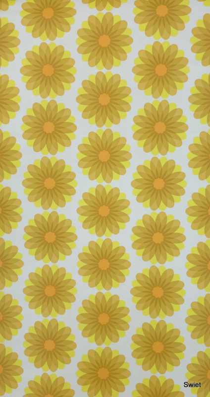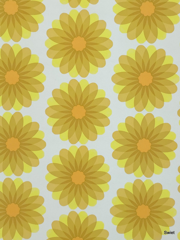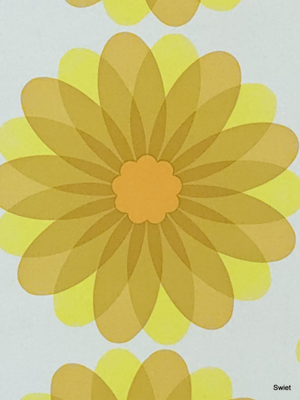 De kleuren bestaan uit verschillende tinten geel en oker met een warm oranje hart op een lichte achtergrond. Het dessin heeft een duidelijk ritme door de verticale herhaling van de bloemvormen. Het is vinyl behang van het merk Leyland.