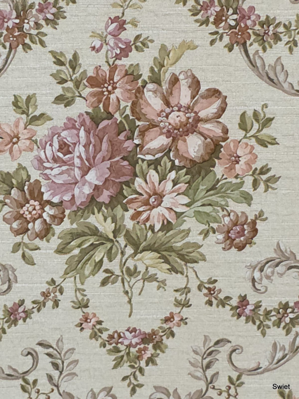 De bloemen zijn uitgevoerd in zachte tinten roze, groen en beige op een lichte achtergrond. De combinatie van bloemen en lijnen vormt samen een duidelijk herhalend dessin. In het papier is een lichte structuur zichtbaar.