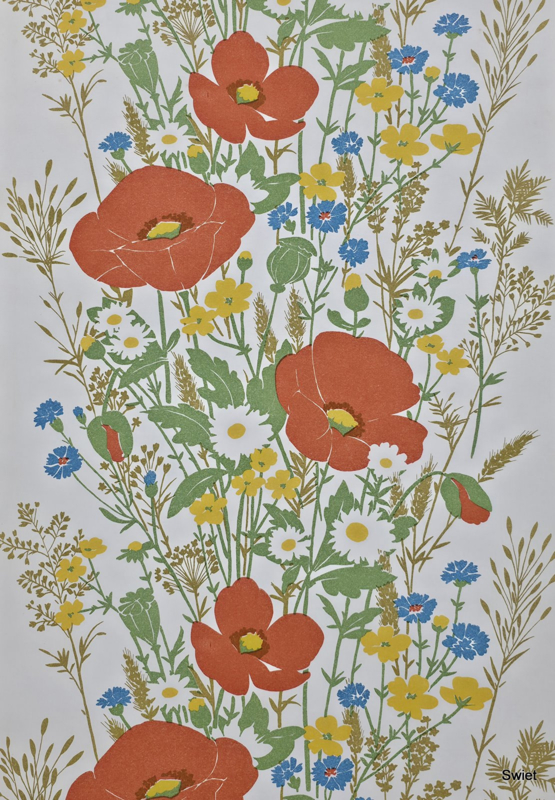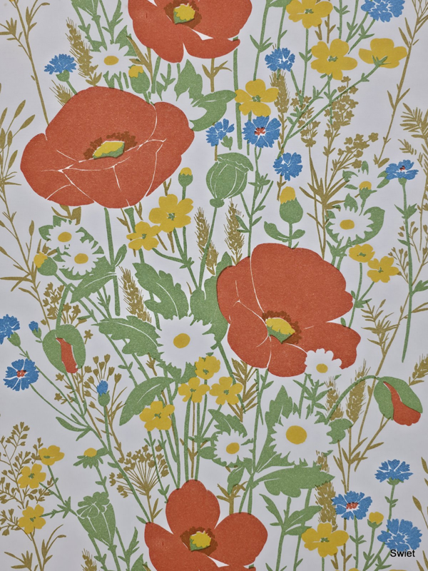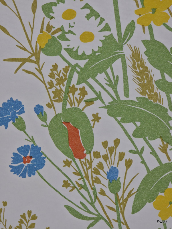 In dit vintage behang komen rood, geel, blauw en groen samen in een frisse mix die meteen aan een veld vol zomerbloemen doet denken. De losse verdeling van de bloemen geeft het dessin een echte jaren 80 uitstraling.
