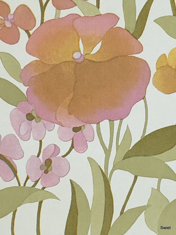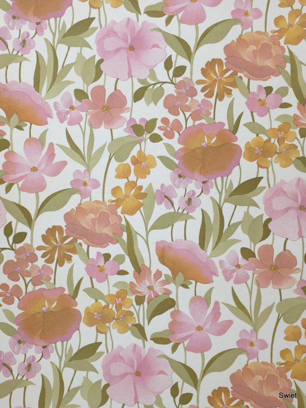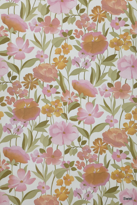 In dit vintage behang overheersen roze tinten, met daarnaast zalmoranje en zachtgroen die samen doen denken aan een los veldboeket. De open verdeling van de bloemen geeft het dessin een luchtige, bloemige uitstraling.