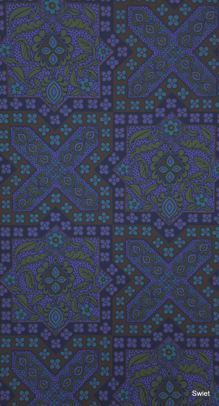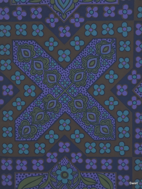 Donkere vakken, schuine banen en vierkante delen wisselen elkaar af. In het patroon zitten kleine bloemen, bladachtige vormen en druppelvormen in paars, blauw, olijfgroen en donkerbruin, met een beetje terra in de ondergrond.