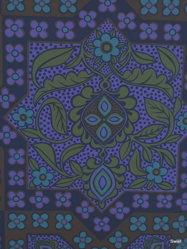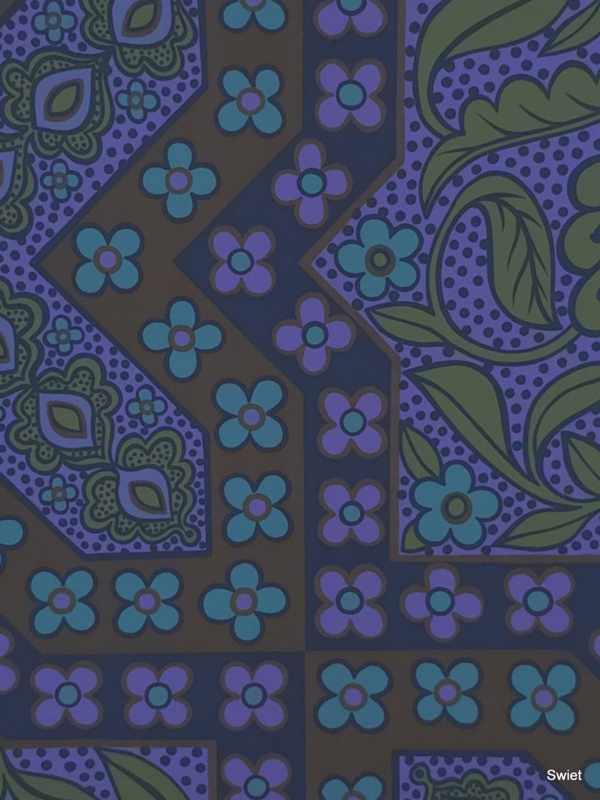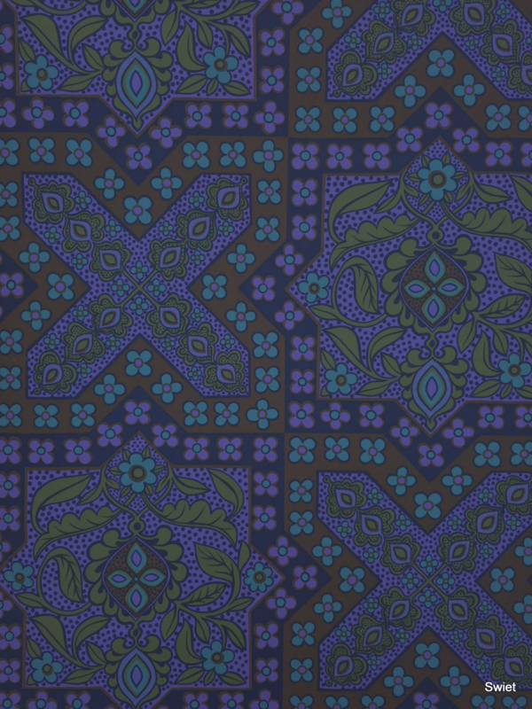 A bold seventies wallpaper in deep purple and earthy tones.