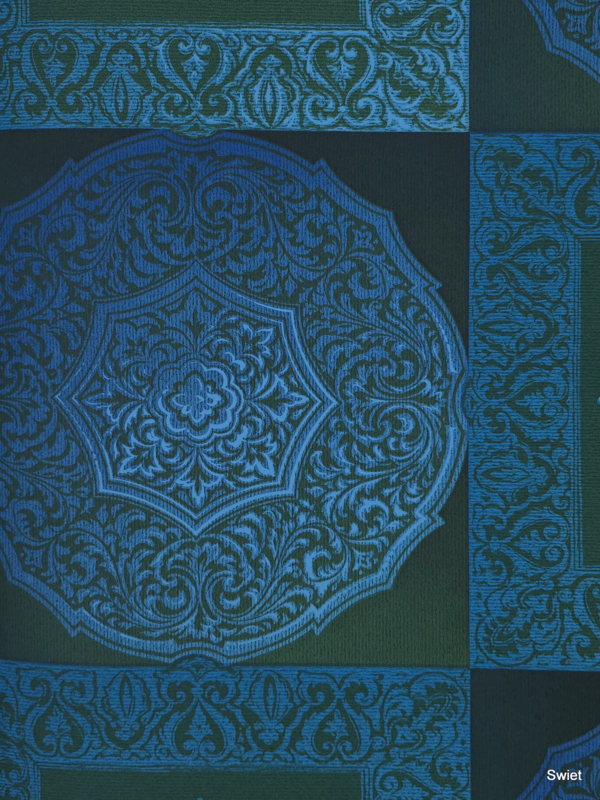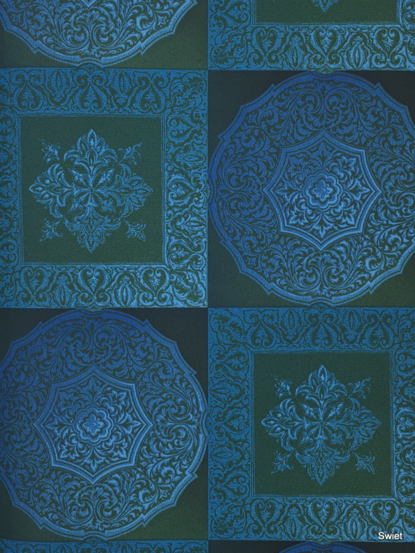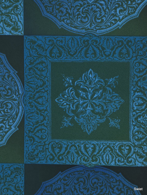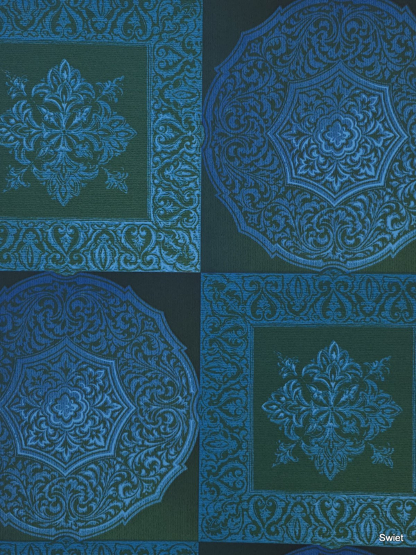 Vierkante vlakken en ronde medaillons wisselen elkaar af in een strak opgebouwd patroon. In de vakken zitten sierlijke krullen, randmotieven en bloemachtige vormen in turquoise en blauw op een donkere groenige ondergrond.