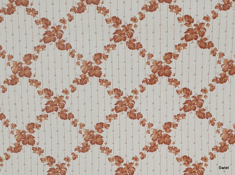 Het is een rustige print, maar door die roestrode kleur blijft hij toch goed zichtbaar. Juist dat maakt dit oude behang zo prettig voor wie graag iets decoratiefs kiest dat niet snel verveelt en op een heel vanzelfsprekende manier ook duurzaam voelt.