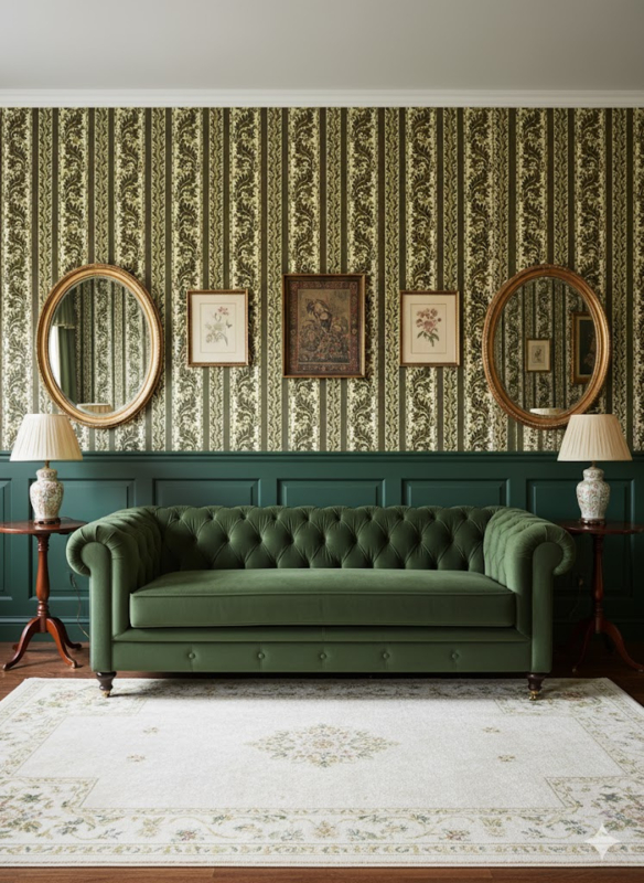 Donkergroen barok behang met een zachte glans, brede en smalle banen met olijfgroene ranken op crème. Klassiek en warm, met diepte .