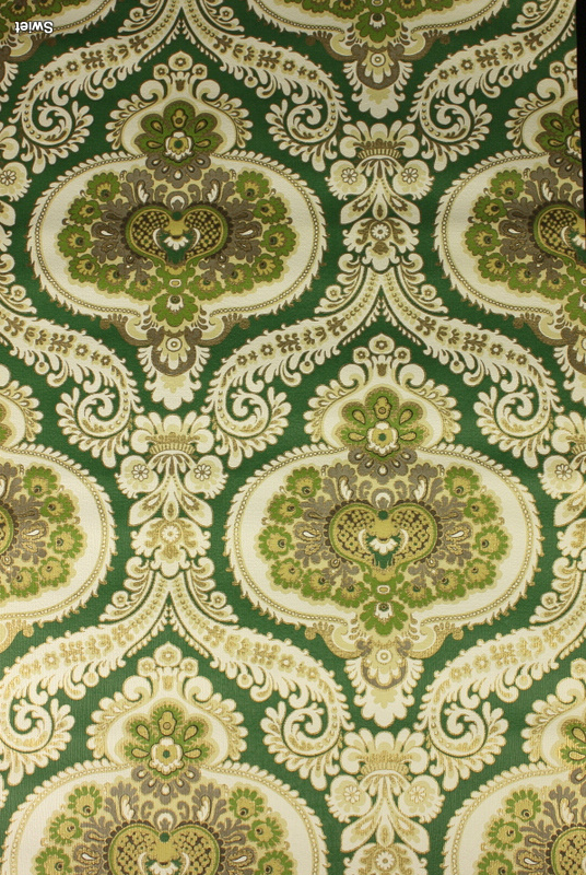 Een klassiek barok dessin met symmetrische vormen en een herhalend patroon. De ondergrond is groen, gecombineerd met crème en zachte bruintinten. De tekening is duidelijk omlijnd en regelmatig opgebouwd, waardoor het behang ordelijk blijft ondanks het decoratieve karakter.