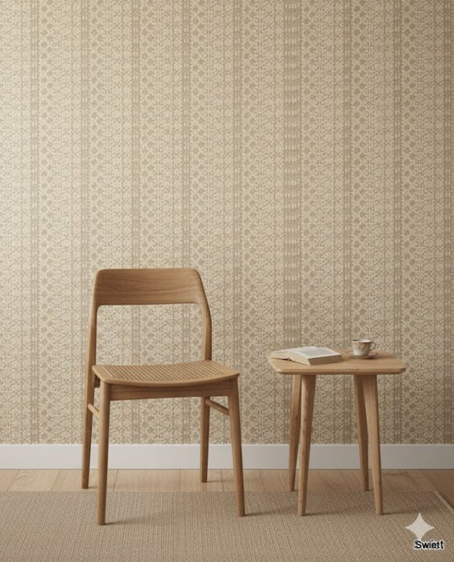 Op de wand wordt het een zachte huid voor de kamer. Van dichtbij zie je detail, van verder weg vooral rust. Past fijn bij licht hout en boeken. Behang van het merk Lunavit.