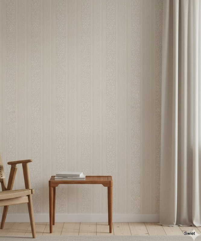 Behang met een zacht geometrisch patroon in verticale banen. De lijnen wisselen af tussen fijne motieven en sierlijke krullen. De crème-beige tinten zorgen voor rust en symmetrie aan de muur.