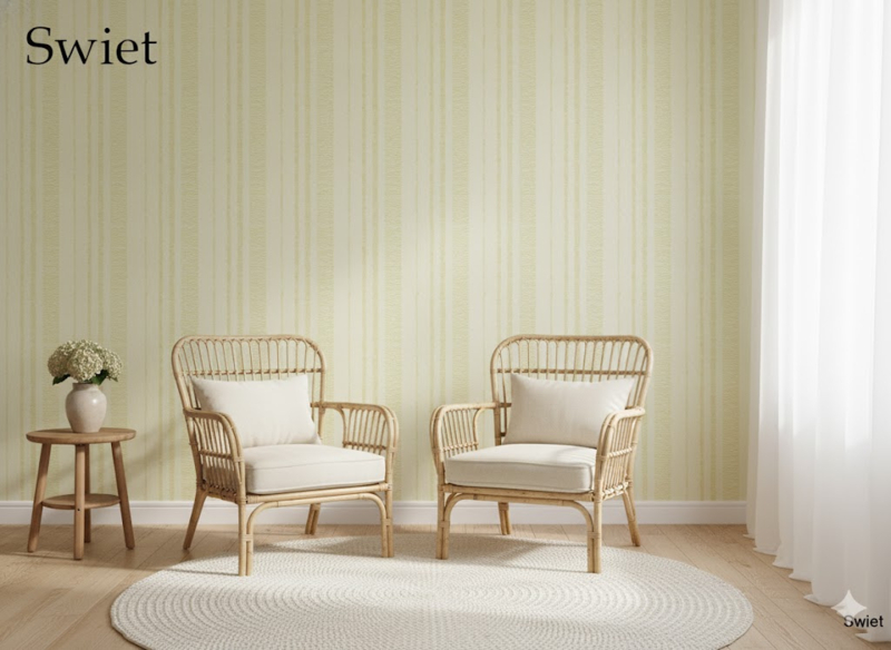 Een zacht vintage behang met subtiele verticale banen in lichtgeel en crème. De lijnen wisselen elkaar af in een speels reliëf waardoor het patroon levendig oogt, maar toch rustig blijft. Het doet denken aan zonlicht dat over een muur glijdt, warm en kalm tegelijk.