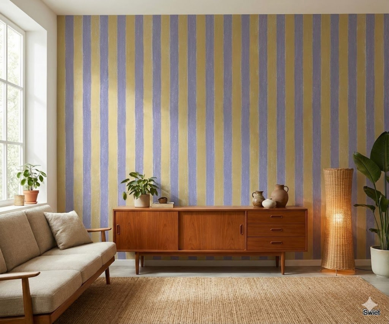 A vintage striped wallpaper in lilac and ochre tones that feels gentle and timeless.