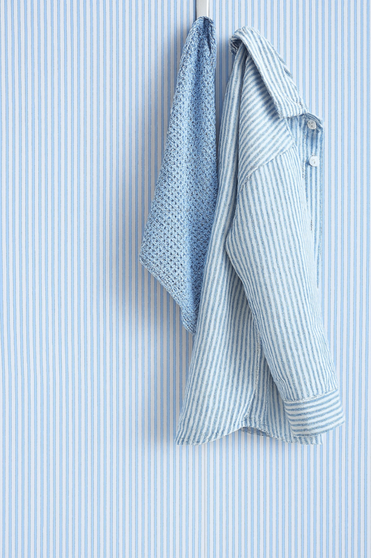 Door die fijne belijning krijgt dit behang iets van een zomer krijtstreeppak, maar dan in een frisse blauw witte uitvoering. Ook als duurzaam alternatief voor nieuw gestreept behang is dit een leuke vondst, zeker voor liefhebbers van vintage behang met een heldere, eenvoudige tekening.