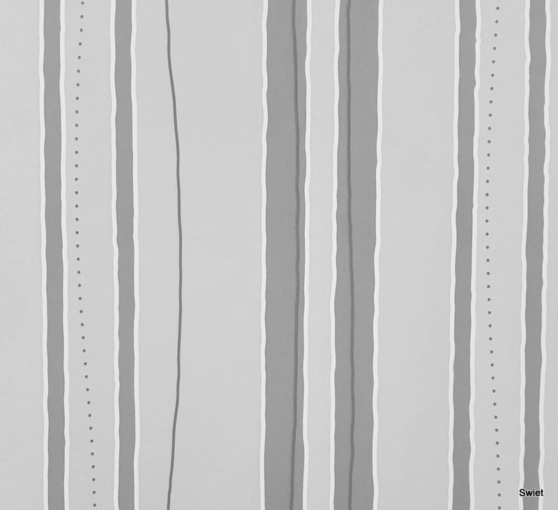 Grijstinten en wit lopen hier in verticale banen naast elkaar, afgewisseld met golvende lijntjes en kleine stipjes. Juist daardoor is dit geen gewone streep, maar een losser en speelser dessin. Het geheel blijft rustig van kleur, terwijl er toch genoeg beweging in zit. Merk is Dutch Wallcovering.
