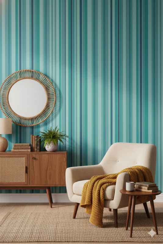 A crisp vintage striped wallpaper in aqua, teal and mint on a light ground; fresh, clean and balanced.