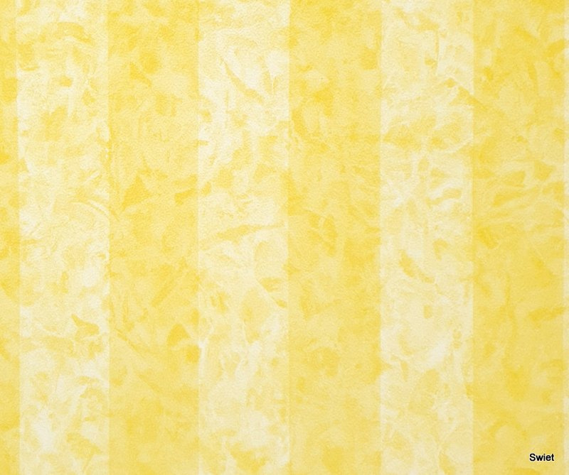 Geel behang met verticale strepen in verschillende geeltinten. In de banen zit een wolkerig patroon van lichtgeel en wit, waardoor het dessin zachter oogt dan een strakke streep.