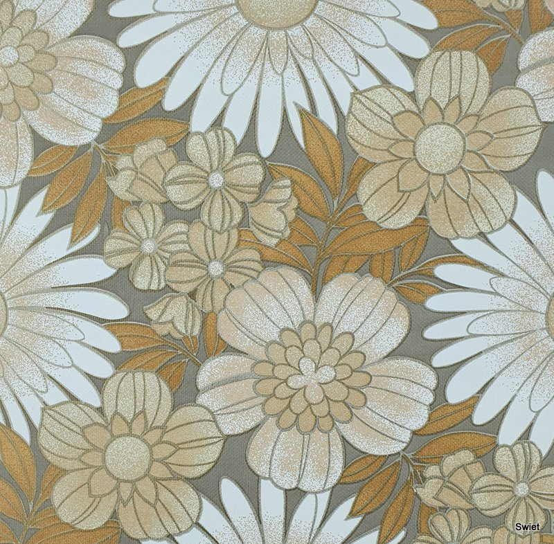 Tegen een grijze ondergrond liggen bloemen en bladeren dicht over elkaar heen in wit, beige, oker en bruintinten. Je ziet margrietachtige bloemen naast rondere bloemvormen, met fijne lijntekening en een licht gespikkelde invulling in de blaadjes en bloemharten.