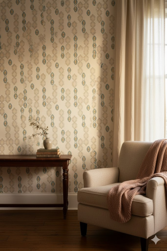 50s behang op een crème basis met verfijnde ornamentjes in lichtgrijs en zachte blauw-accenten.Het patroon loopt verticaal waardoor het rustig omhoog trekt, zonder aanwezig te worden.Voelt klassiek maar ook fris, alsof je in een oud huis binnenkomt waar alles licht en zacht is gebleven.Fijn als je een ruimte een subtiel beetje elegantie wilt geven zonder dat er iets overdrevens gebeurt.