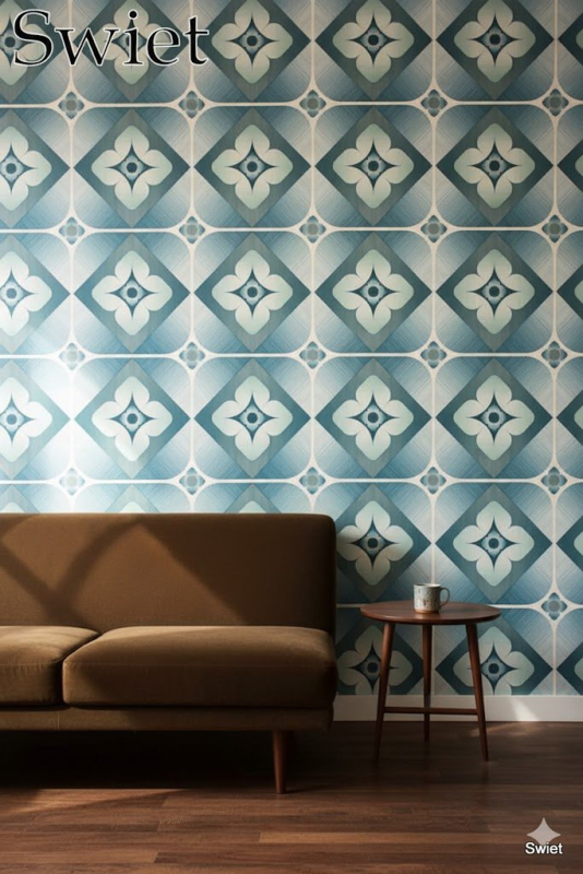 Bold blue-green graphic squares with a clear 70s vibe, clean and cool.