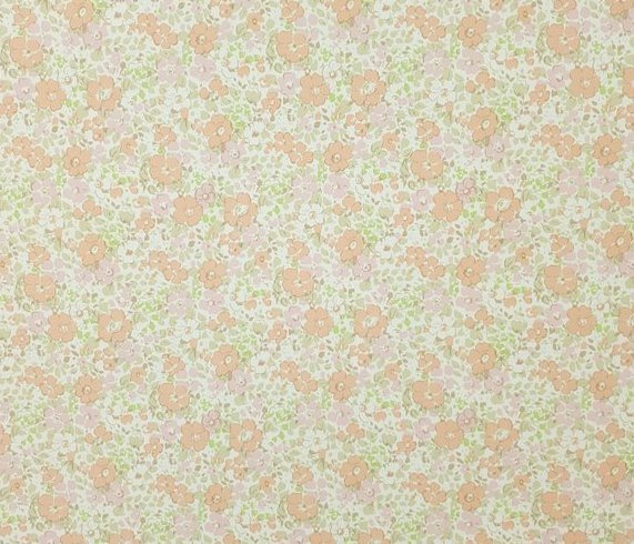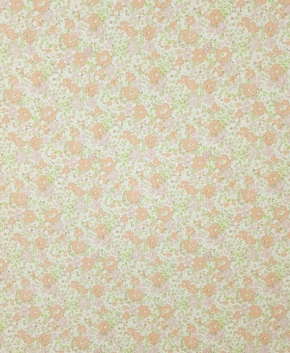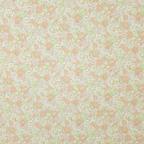 Een dicht patroon van kleine bloemen en blaadjes loopt over de hele witte achtergrond. Zacht zalmroze, lichtgroen, beige en lichtbruin wisselen elkaar af, waardoor het dessin vol oogt en overal hetzelfde fijne ritme houdt.