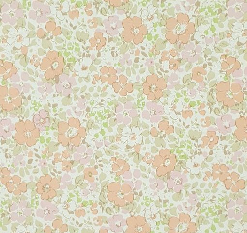 A soft vintage wallpaper with small flowers in salmon pink, green and beige on a white background.