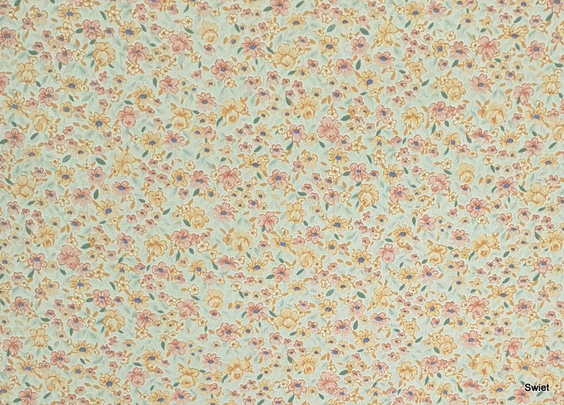 Over de zachtgroene ondergrond ligt een dicht patroon van kleine bloemen, blaadjes en fijne rankjes in gebroken wit, roze, oranje en een beetje blauw. Het dessin is klein en gelijkmatig verdeeld, waardoor de bloemen als een doorlopend veld over het hele papier liggen.
