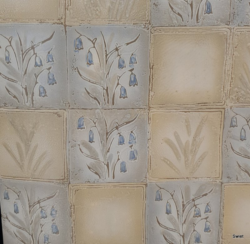 Vierkante tegelvlakken in beige en bruin wisselen af met vakken waarin kleine blauwe bloemen staan. Sommige tegels zijn effen, andere hebben een bloemmotief of een bladachtige vorm. Het patroon is strak opgebouwd en loopt in een duidelijke tegelverdeling over het hele vlak.