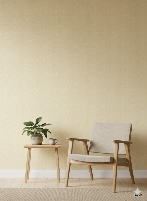 Een subtiel houtnerf-moiree dessin in zachte crème (licchtgeel/beige) tinten. Mooie rustige basis met een knipoog naar natuurlijke materialen. Niet schreeuwerig, gewoon tijdloos en warm.