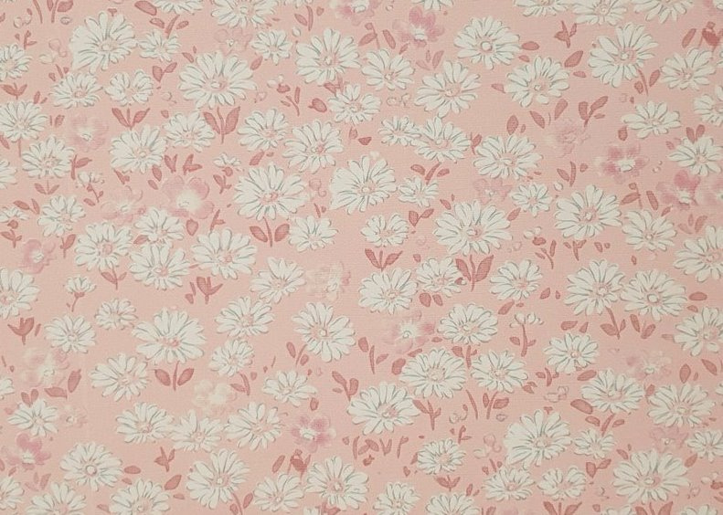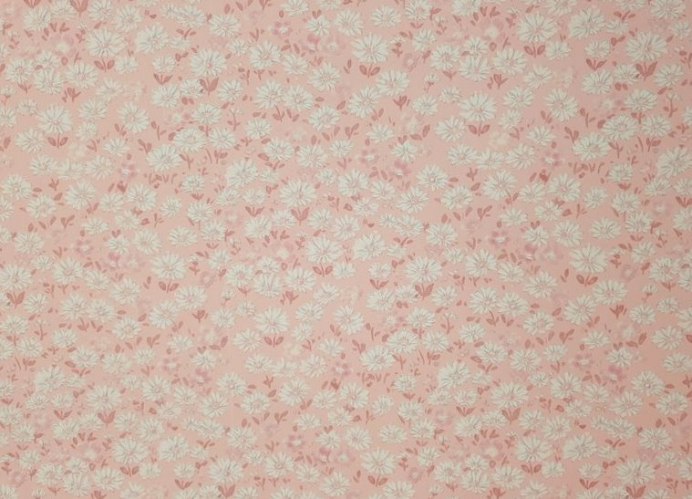 Witte bloemen liggen los verspreid over een roze achtergrond, met daartussen kleine roze blaadjes en fijne bloemvormen. In een paar witte bloemen zit een heel zacht vleugje blauw, waardoor het dessin net wat meer diepte krijgt zonder zijn zachte kleurbeeld te verliezen.