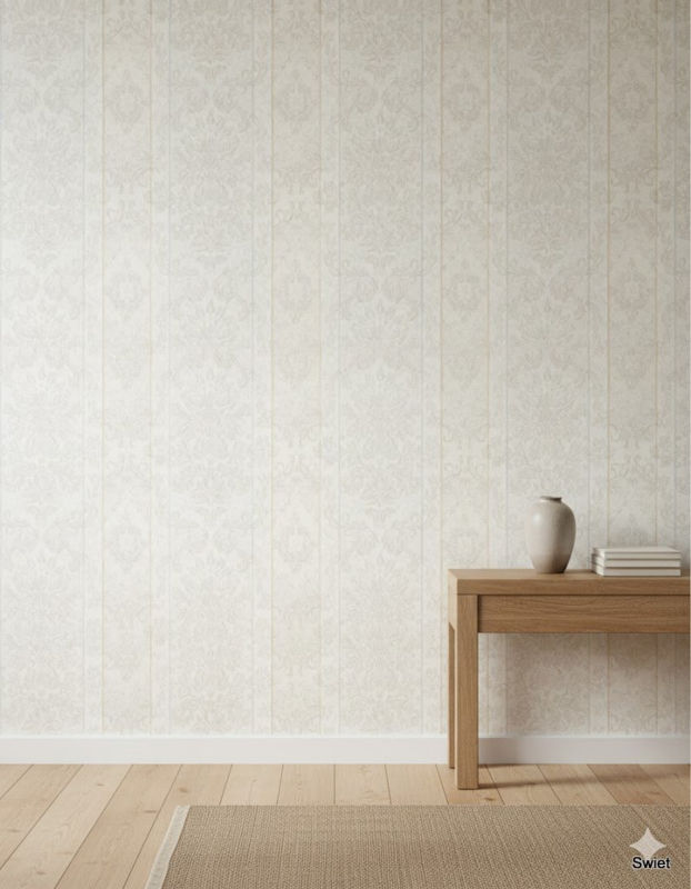Vintage wallpaper with classic baroque ornamentation in vertical pastel panels. A soft, elegant design with timeless charm.