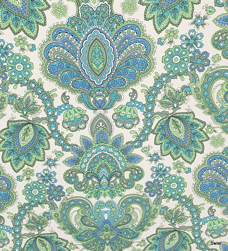 Op een lichte ondergrond staat een dicht patroon met grote paisleyvormen, bloemetjes en krullende lijnen in wit, blauw, turquoise, aqua groen en fijne antraciete lijntjes. De vormen staan strak tegen elkaar aan en geven het dessin een vol en levendig ritme.