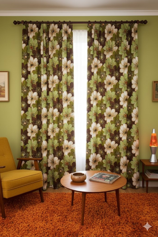 Groen en bruin met grote bloemen.