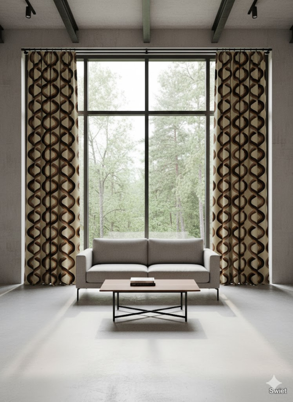 Mooie vintage Giltex gordijnstof, styled by Giltex of London. Met een mooie glanslaag. De stof is 120 breed, je ziet de helft van de breedte van de stof, een een detailfoto. Bij hoogte stat de hoogte waarop het patroon zich herhaalt.