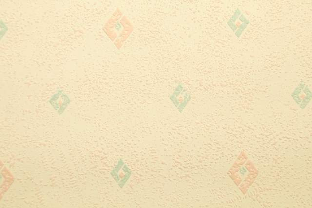 A vintage wallpaper with small diamond shapes in green and salmon on a soft salmon background.